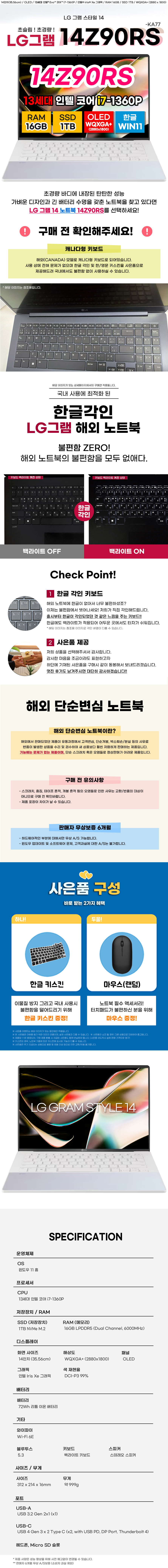 LG그램스타일 14Z90RS-KA77 13세대 i7 16GB 1TB OLED 노트북